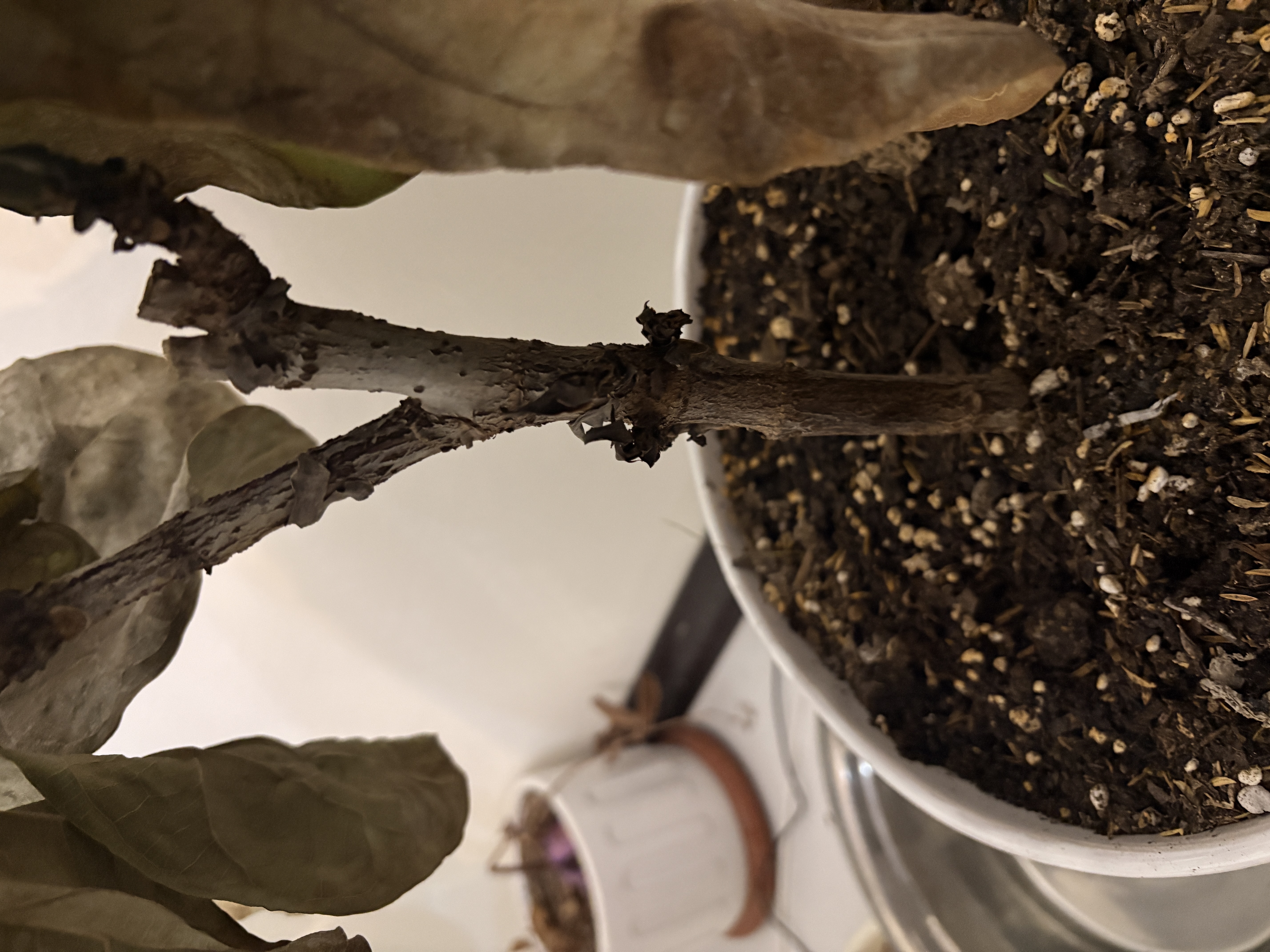 به نظر میرسد گیاه دچار اسیب شدید شده است . قسمتی از ساقه ی پایینی را برش دهید اگر شیره ی سفیدرنگ از گیاه خارج نشد متاسفانه نمیتوان برای گیاه کاری انجام داد و از بین رفته است . اما اگر شیره ی سفیدرنگ به مقدار زیاد خارج شد گیاه هنوز زنده است و با راهکارهایی که در کامنت قبل بیان شد دوباره سبز خواهد شد . برگهای اسیب دیده را نیز کاملا حذف کنید .