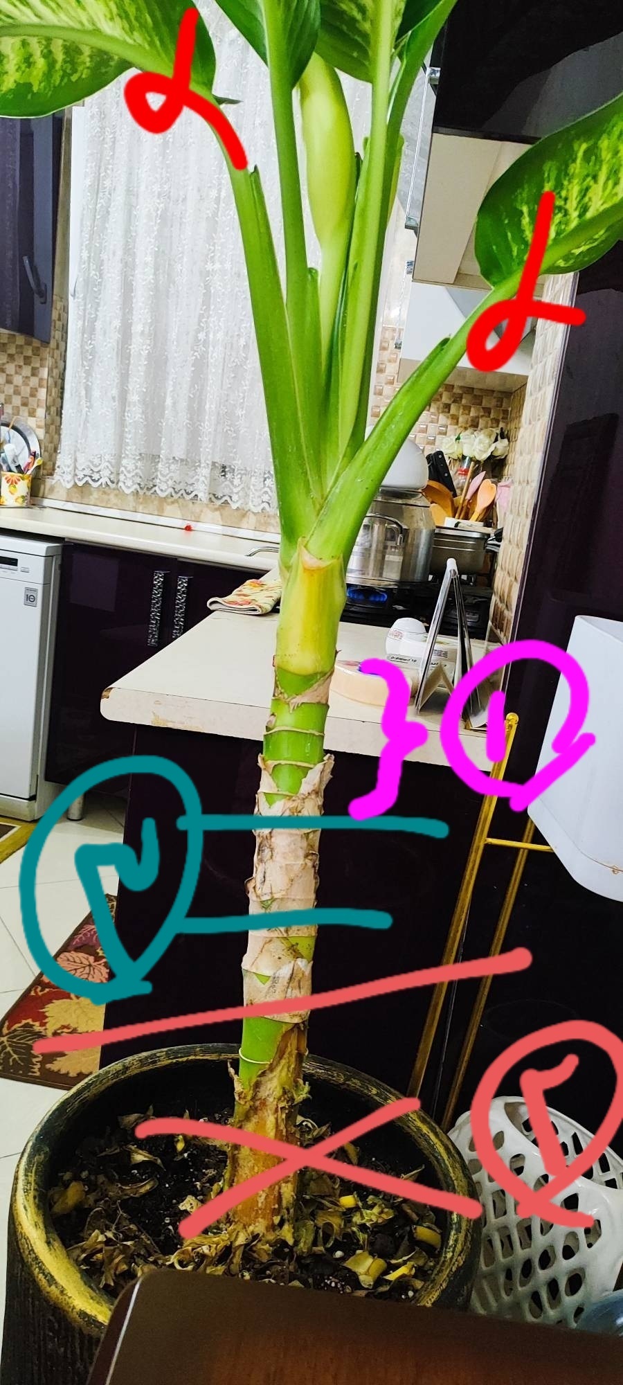 شماره ۱- قسمتی از ساقه که در شماره ی ۱ مشخص شده ، بعد از جدا شدن و اطمینان از سلامت بافت داخلی ساقه ، باید در زمان کاشت گیاه داخل خاک قرار بگیرد حدودا دو یا سه گره از ساقه باید داخل خاک باشد . شماره ۲- این قسمت کاملا حذف و به همراه خاک گلدان دور ریخته شود . شماره ۳- این قسمت از ساقه هم اگر سالم است میتوانید در گلدانی دیگر بصورت افقط روی خاک قرار دهید تا جوانه ها از بالای گره ها برویند . دو برگ بالایی که با ضربدر قرمز مشخص شده حذف شود تا ریشه زایی زودتر انجام شود .