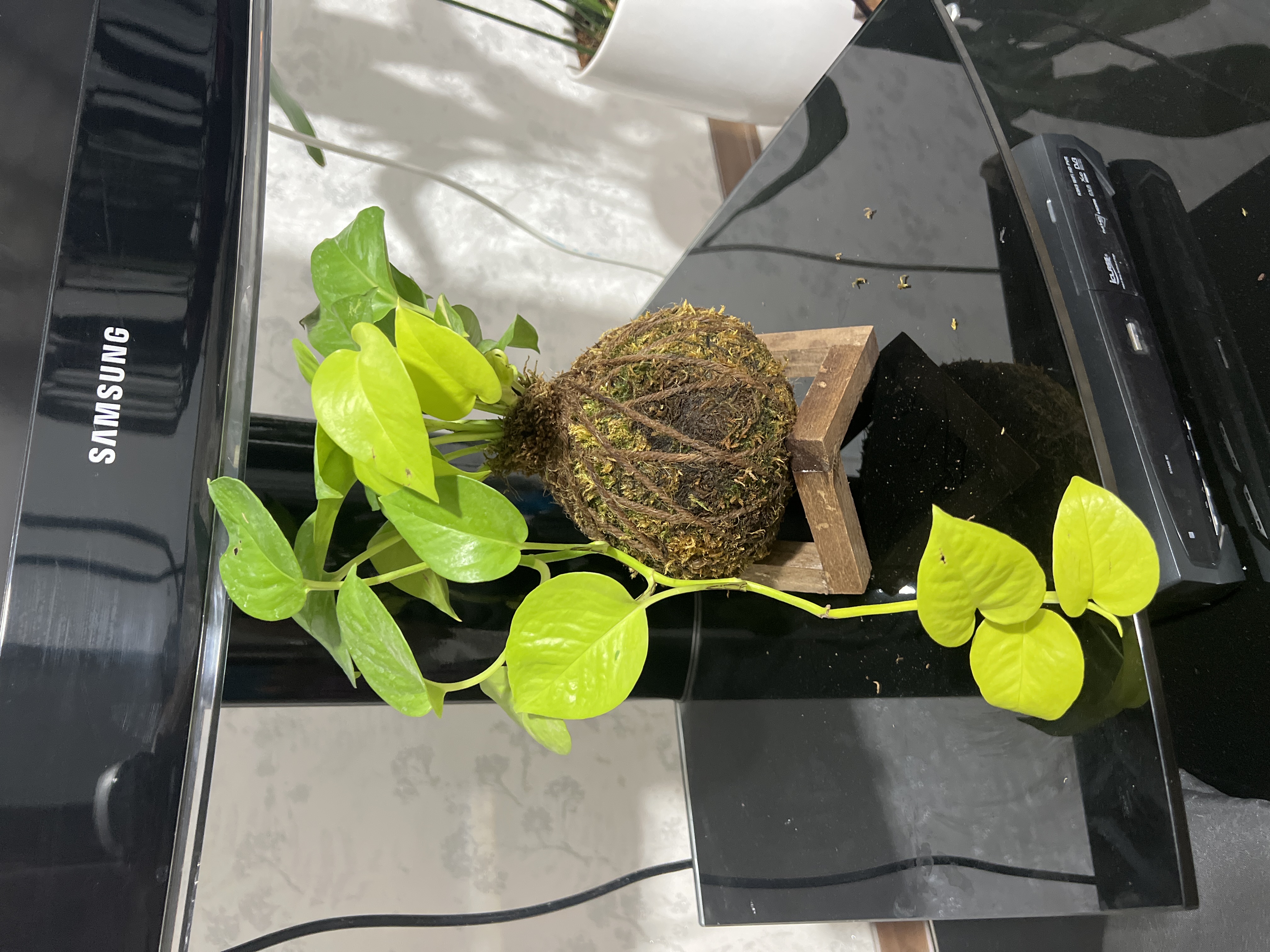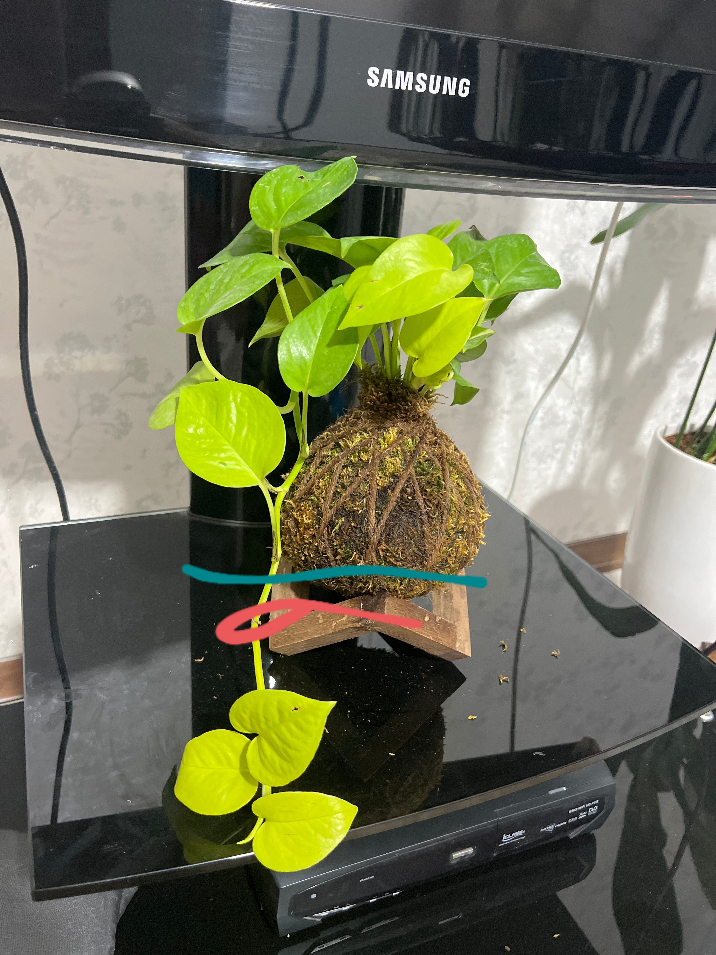سلام وقت بخیر . پتوس انواع مختلفی دارد . گیاه شما پتوسِ نئون است . و رنگ برگها به صورت طبیعی به این رنگ میباشد . هر چه گیاه نور بیشتری دریافت کند رنگ برگها زردتر و در صورت کمبود نور رنگ برگها بصورت سبز تقریبا مات ، تغییر میکند . تصویر ذیل پتوس نئون میباشد که گیاه شما نیز از این گونه است . گیاهان را نباید در کنار سیستم های صوتی و تصویری قرار دهید . گیاه را در کنار پنجره ی نورگیر قرار داده و هرزمان توپ خزه ای سبک شد آنرا در داخل اب قرار دهید تا آبگیری کند . سبک ی که گیاه شما در ان کاشته شده کوکداما نام دارد .