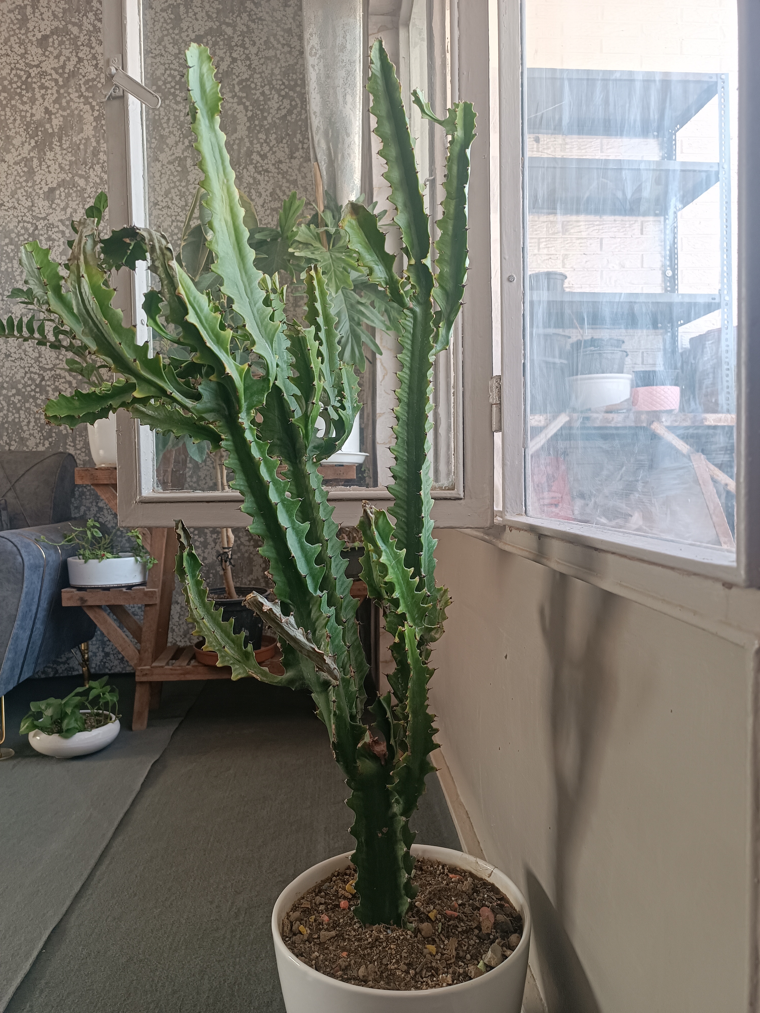 اگر ساقه ی اصلی نیز دچار اسیب شده باشد نشانه اینست که بافت داخلی گیاه اسیب جدی دیده و شما نمیتوانید کل گیاهی با این سایز را نجات دهید و چاره ای جز قلمه گیری از قسمتهای سالم ندارید . قلمه ها را در گلدانی با سایز کوچک بکارید و از خاک تازه مخصوص ساکولنت استفاده کنید. اما اگر ساقه و تنه ی اصلی کاملا سالم باشد فقط قسمتهای آسیب دیده ی ساقه های جانبی را حذف کنید . افوربیا ها گیاهانی هستند که به محیطی با تهویه ی خوب و دمای یکنواخت نیاز دارند . افراط و تفریط در آبیاری و تهویه ی نامناسب محیط باعث میشود این گیاهان آسیب ببینند و متاسفانه زمانی که سایز گیاه بزرگ باشد و قسمتهای مختلف ساقه در نقاط متعدد دچار اسیب و پوسیدگی و بیماری شده باشد ناچار به قلمه گیری از قسمتهای سالم گیاه هستید و باید گیاه را دوباره ریشه دار کنید . هر چند در این فصل ریشه زایی بسیار کند انجام خواهد شد چون فصل رشد گیاه نیست اما اگر قلمه ها را در محیطی گرم با تهویه ی خوب قرار دهید و آبیاری قلمه ها را به اندازهی کافی و منظم و به درستی انجام دهید میتوانید انها را ریشه دار کنید . با این وضعیتی که گیاه دارد استفاده از قارچ کش تاثیر چندانی نخواهد داشت اثر ان موقت خواهد بود . سایز گلدان کاکتوسها و ساکولنتها نباید بزرگ باشد زیرا احتمال پوسیدگی و شیوع بیماری را در این گیاهان بالا میبرد .