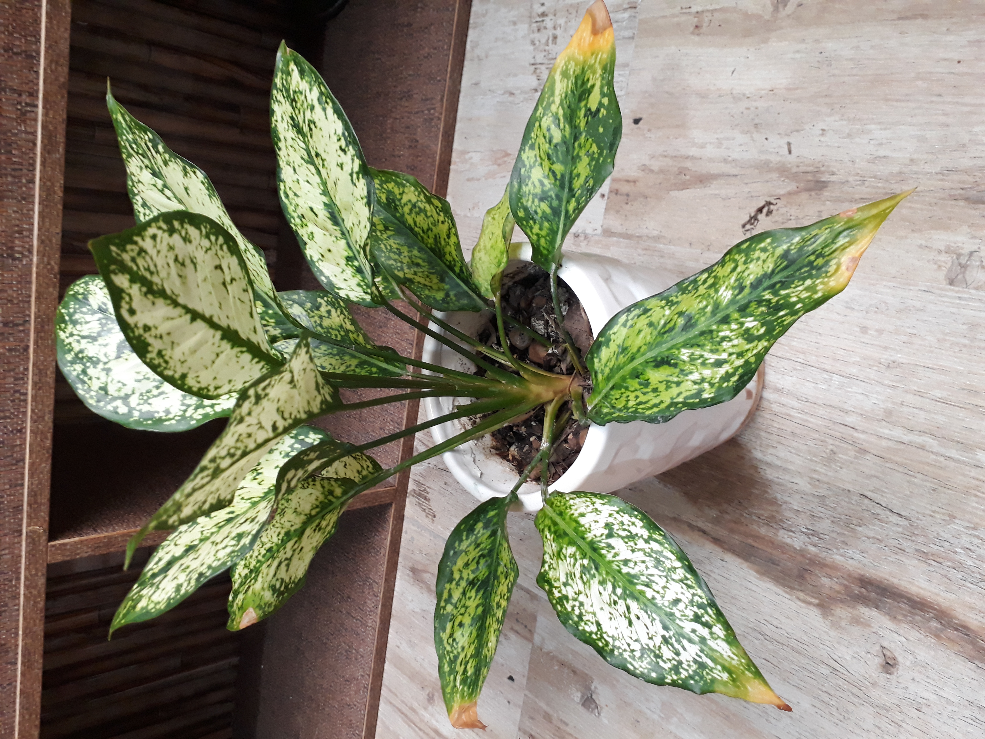 این گیاهو یکساله که از گلخونه خریدم. توی اتاق نزدیک به پنجره شرقی نگهداری میکردم و هفته ای یکبار اب مبدادم. طوری ک کاملا از زیرگلدونی بیرون میریخت. خاک سبکی داره نمیدونم اسم خاکش چیه ولی درطول این یکسال کمی فرونشست کرده و توش یه عالمه برگ وجود داشته. یه مدت شپشک ارد الود داشت ک خوشبختانه خیلی وقت پیش درمانش کردم. الان یه مدتیه لکه های زرد روی برگاش داره و برگ جدیدی درنیاورده. و برگها از هم فاصله گرفتن و متراکم شدن. تا ۴-۵سانت خاک خشک میشه بهش اب میدم. به تراس شمالی انتقالش دادم ک نور بیشتری داره. نگران بودم قارچ گرفته باشه قارچ کش خونگی استفاده کردم. محلول جوش شیرین و مایع ظرفشویی. ۳ بار در ۱۰ روز اخیر به زیر و روی برگاش اسپری کردم. احساس میکنم ساقه ش به زردی میزنه ک نمیدونم طبیعیه یا از قبل بوده یا نه. یکی از برگها ک سالم هس احساس میکنم از قسمت نزدیک ساقه سفتی نداره