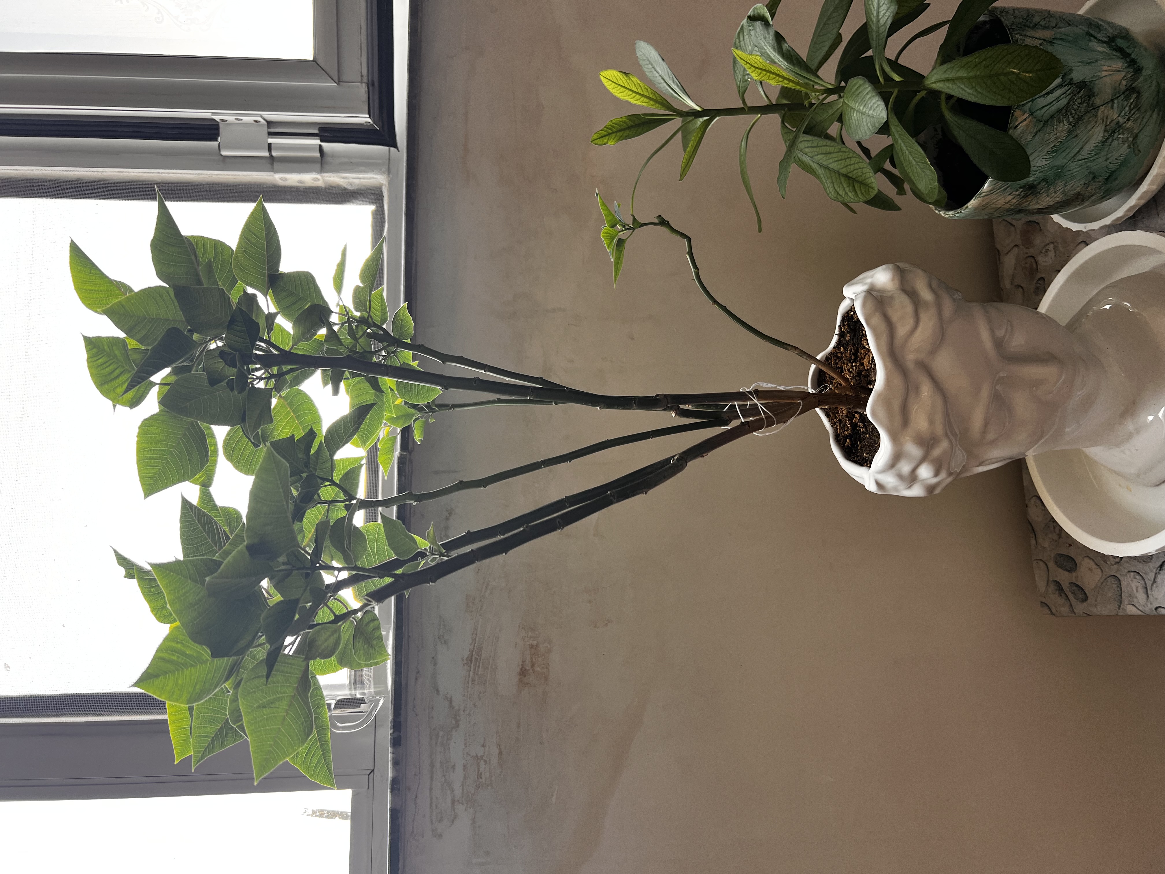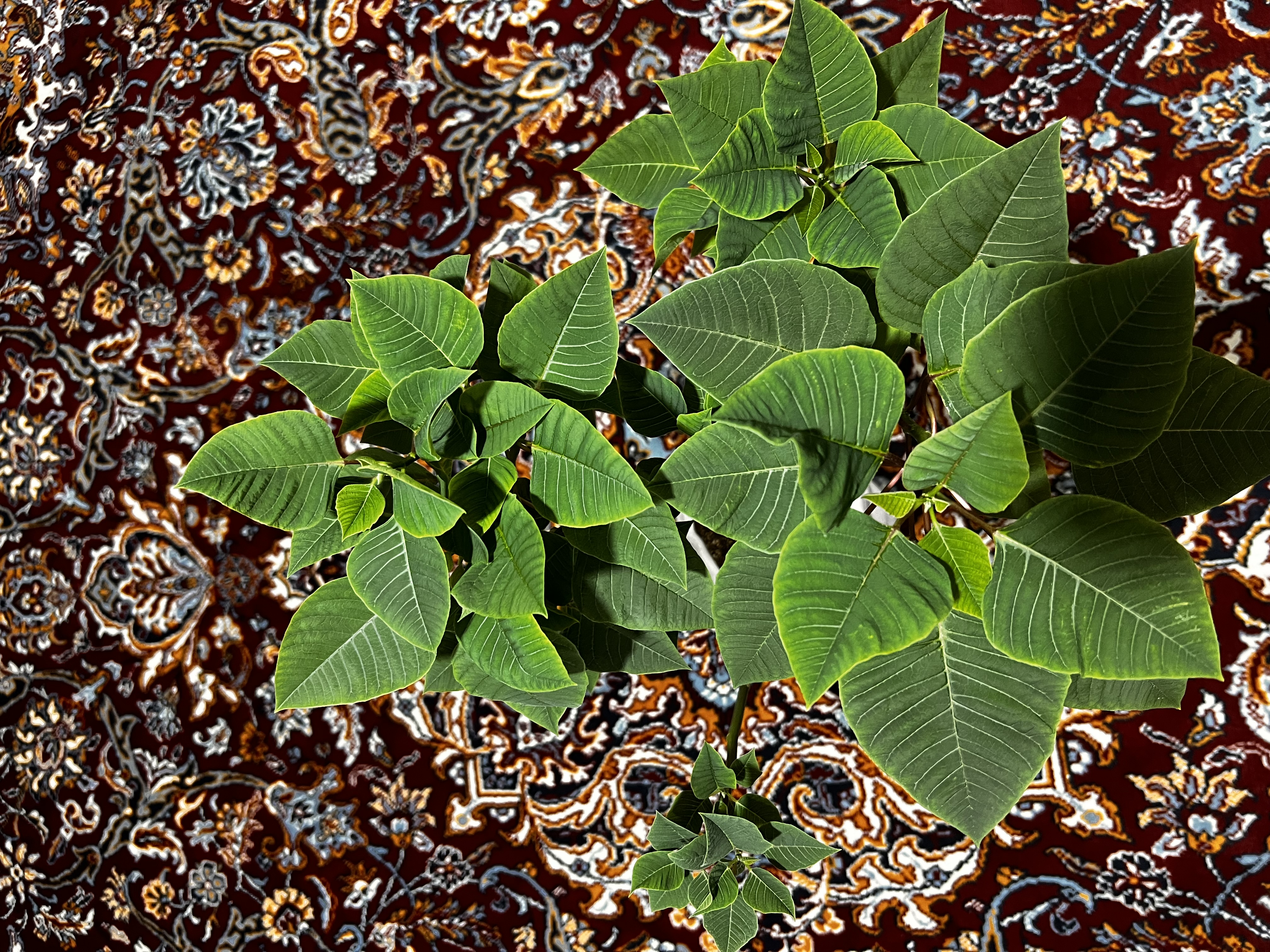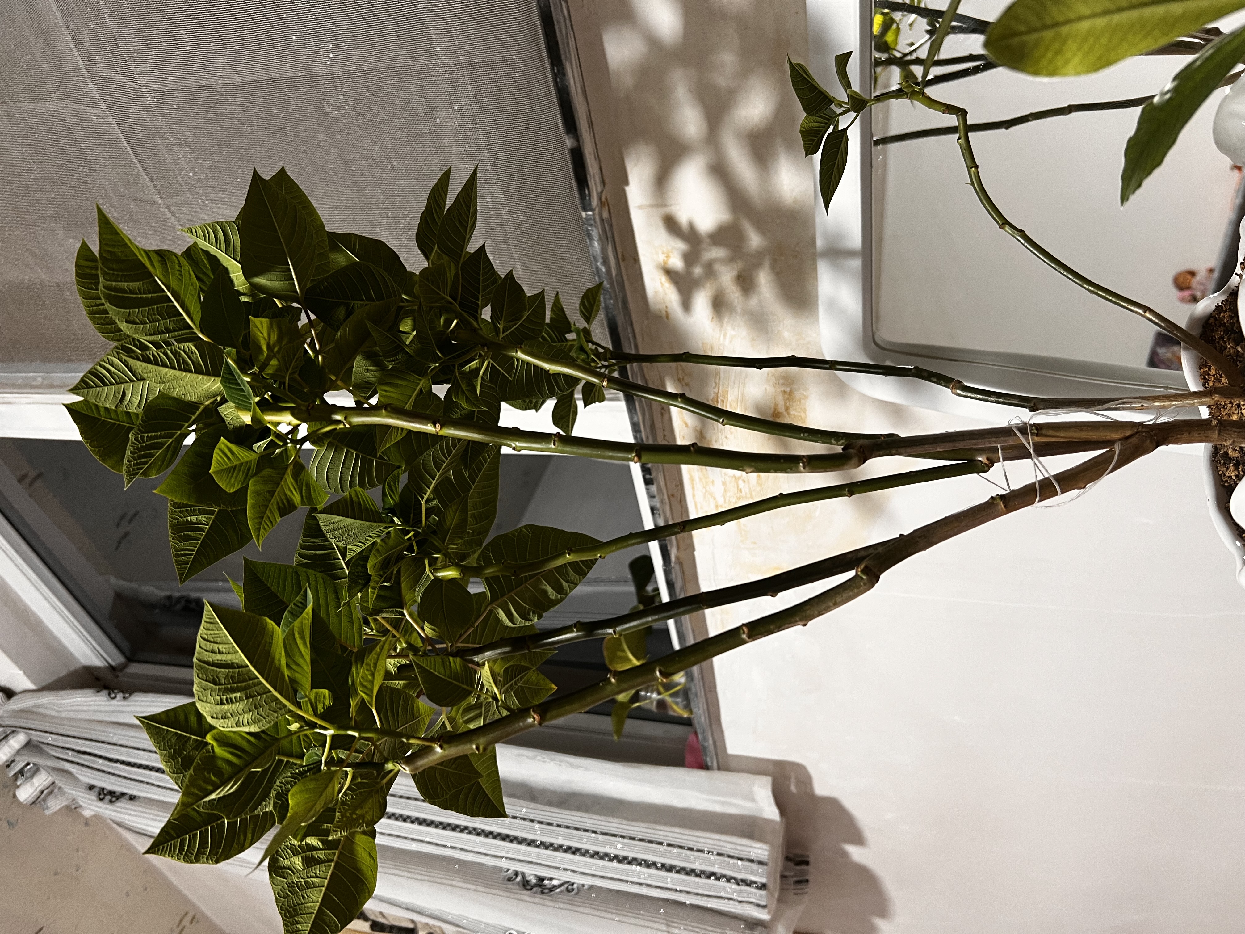 هر وقت سطح خاک گلدان خشک شد به میزانی اب میدم که چند قطره وارد زیر گلدانی بشه نور از پشت توری پنجره میتابه و الان که تابستونه پنجره بازه و گیاه در معرض باد و هواس ساقه های اصلی بلند همراه با برگهای قرمز قدیمی رو هفته قبل کوتاهتر کردم