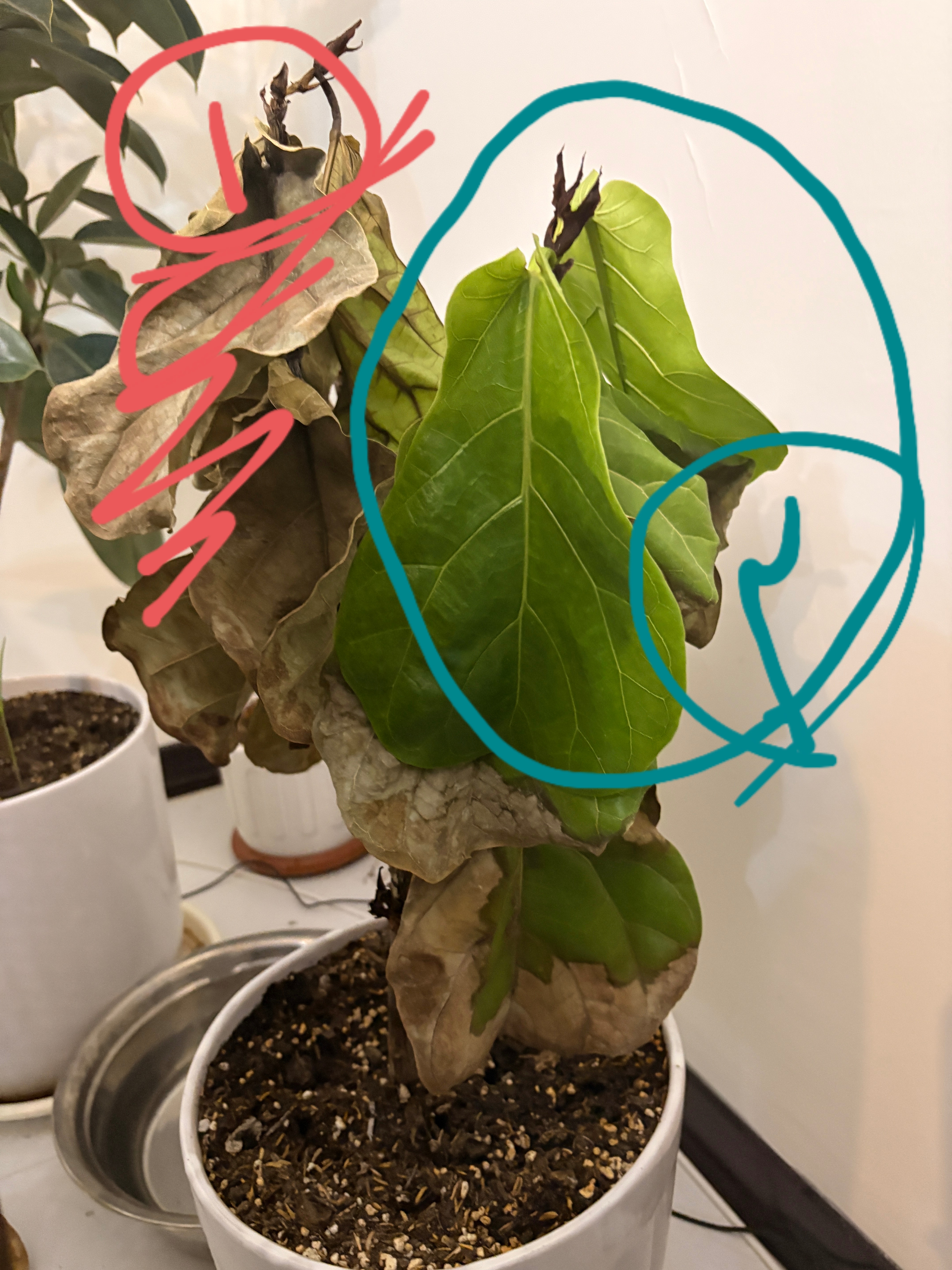 بخش ی که با شماره ۱ و با رنگ قرمز علامت زده شده ظاهرا کاملا خشک شده اما بخش شماره ی ۲ که برگهایش سبز هستند ولی حالت افتاده دارند را شاید ( اگر بافت ساقه سالم باشد) بتوانید بعنوان قلمه استفاده کنید . برش را از زیر قسمتی که برگ به ساقه متصل شده بزنید . البته اگر شیره ی سفیدرنگ از محل برش خارج نشد و یا ترشح ان بسیار کم بود ، متاسفانه این بخش از ساقه هم از بین رفته و نمیتوان گیاه را احیا کرد .