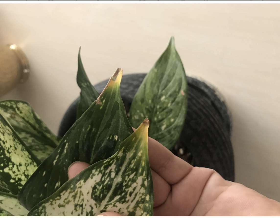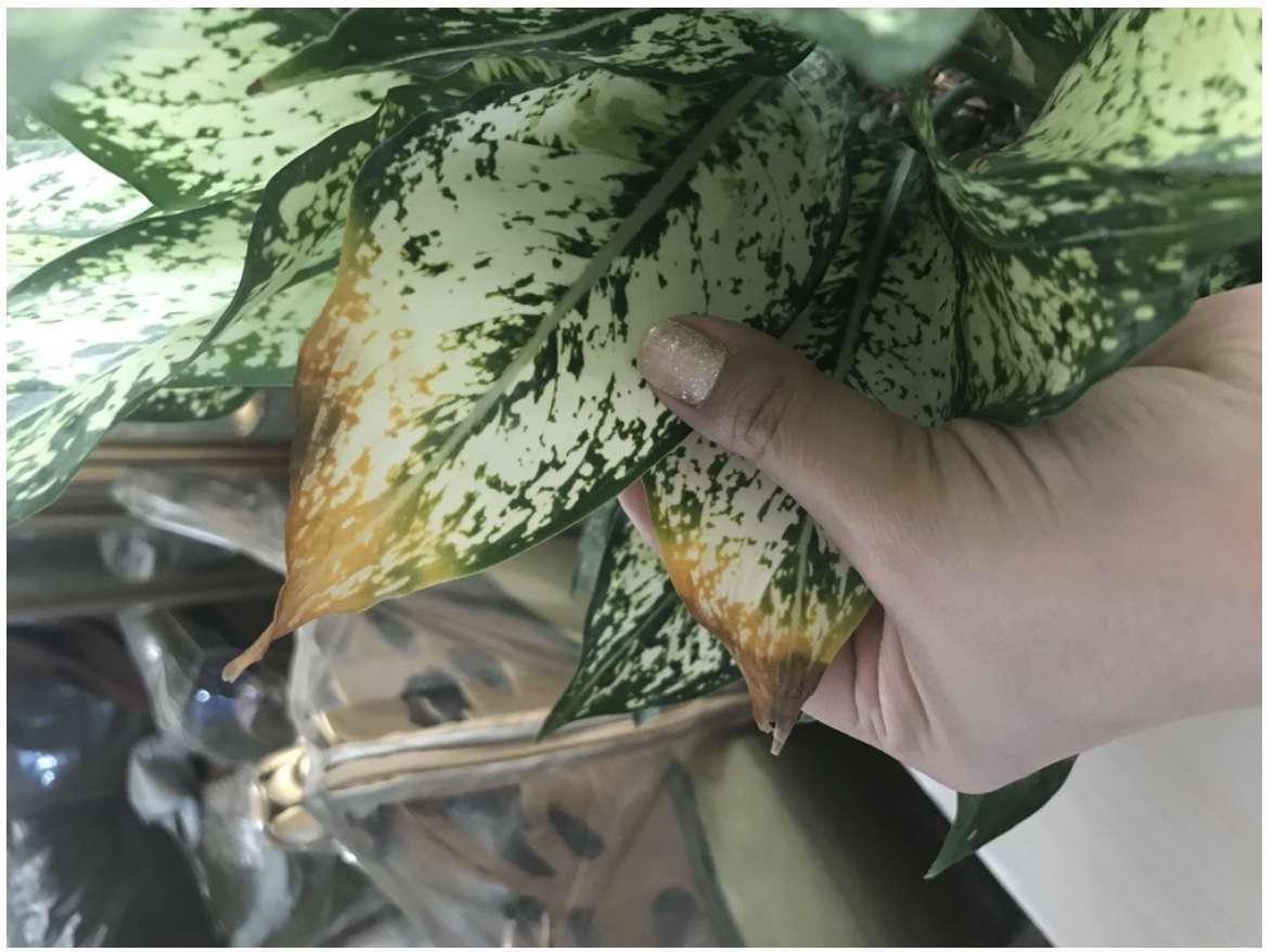نه به این علت نیست .چون آگلونما برفی زیاد گیاه حساسی نیست . غبارپاشی را هم فعلا قطع کنید . آخرین باری که از قارچ کش استفاده کردید کی بود و از چه قارچ کشی استفاده کردید؟
