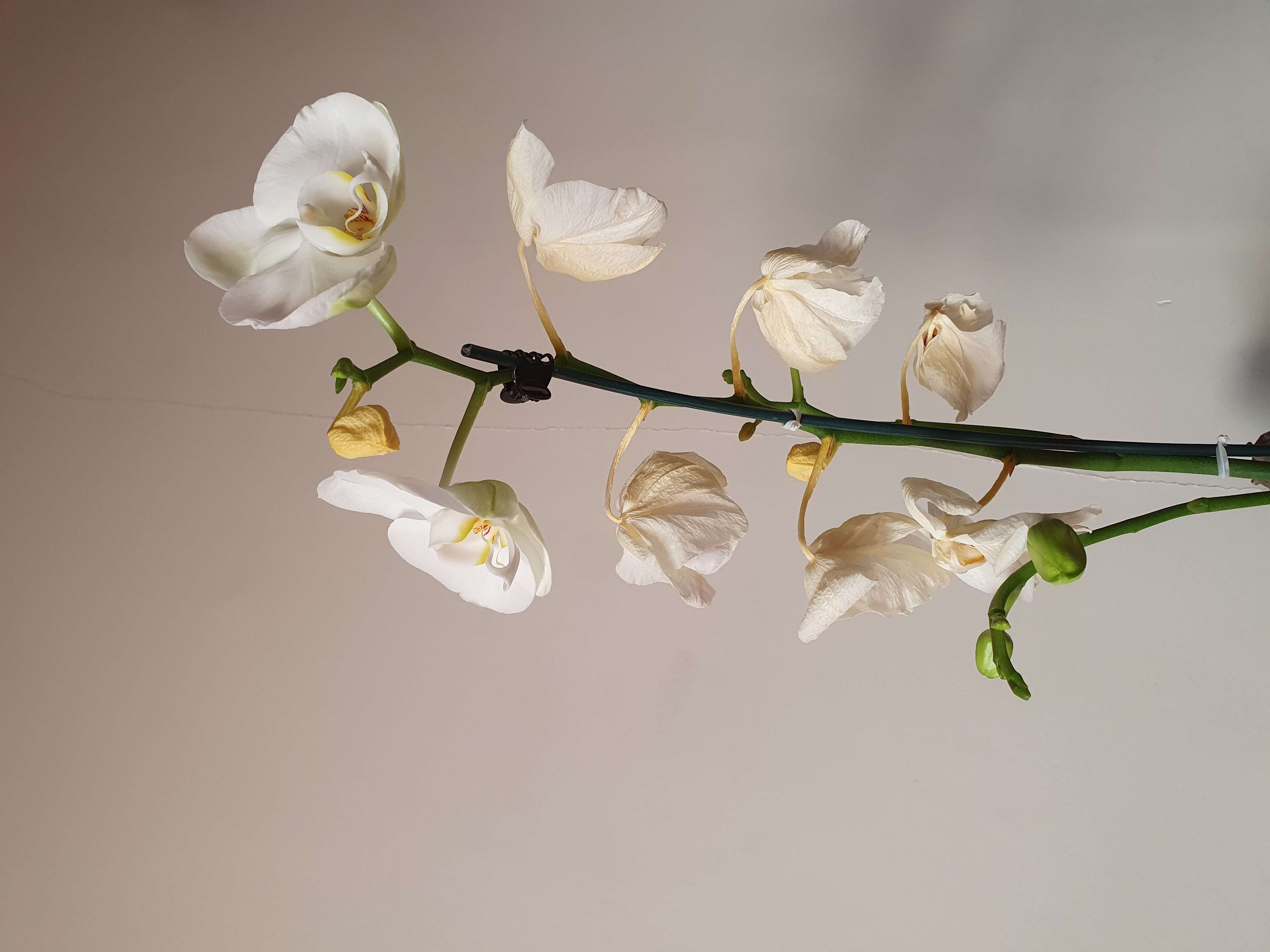 سلام وقتتون بخیر .گلهای ارکیده بعد از شکوفایی حدود یکماه برروی ساقه باقی میمانند .اگر گلدان را در محیطی خنک تر قرار دهید دوام گلها بیشتر است اما در نهایت بعد از تمام شدن عمر گلهای ارکیده , گلها خشک شده و از بین میروند . اگر به همراه گلهای کاملا باز شده , غنچه های باز نشده هم خشک شده و میریزند میتواند بعلت گرمای محیط و کمبود رطوبت و افراط و تفریط در آبیاری این مشکل ایجاد شده باشد .که با برطرف کردن این موانع میتوانید به شادابی گیاه کمک نمایید . بعد از اتمام دوره ی گلدهی و با خشک شدن ساقه ی گل دهنده , باید ساقه ی گل را از گیاه جدا نموده و گلدان را تعویض نمایید و یا اگر گیاه هنوز فضای کافی برای رشد در گلدان را دارد گلدان را عوض ننموده و گیاه را تغذیه ی مصنوعی نمایید .کودهای سه بیست و یاپتاس و فسفر بالا برای تغذیه کودهای مناسبی هستند .اگر سوالی دارید در خدمتتونم