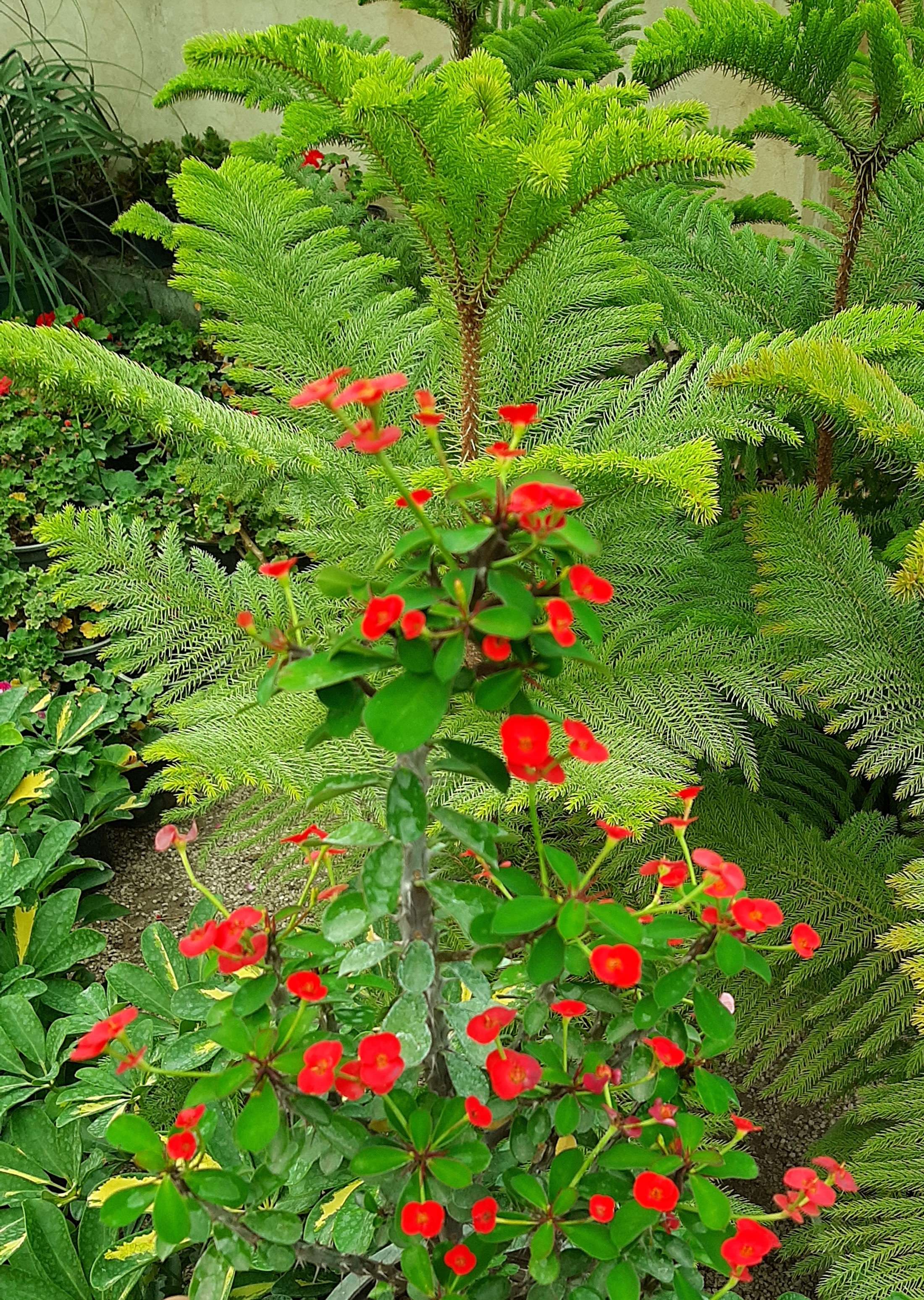 این گیاه افوربیا میلی یا مرجان است .مرجان گلهایی به رنگ سفید , قرمز و صورتی و ابلق و لیمویی دارد و همچنین انواع مختلفی مانند مرجان معمولی , مینیاتور و گل درشت در بازار موجود است . نگهدار مرجان مانند نگهداری ساکولنتهاست و به آبیاری منظم و خاکی با زهکشی زیاد نیاز دارد . میتوانید در باکس وسط ترکیبی از سه رنگ مرجان بکارید .چون در هر نظر فقط میشه عکس یک گیاه را انتخاب کرد من در نظرات مختلف عکس گیاهان مختلف رو براتون میفرستم در آخر اگر سوالی داشتید در خدمتتون هستم