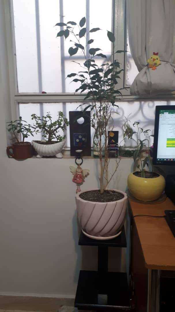 برگ ها از پایین بیشتر میریزه و شاخه ها داره از پایین خشک میشه، نمیدونم چون پایین بهش کمتر نور میخوره اینجوری شده؟ الان تو این عکس یه پایه دیگه گذاشتم زیرش بیاد بالاتر و نور کامل به همه جاش بخوره ول یکلا نورگیر نیست اتاق، خصوصا زمستون