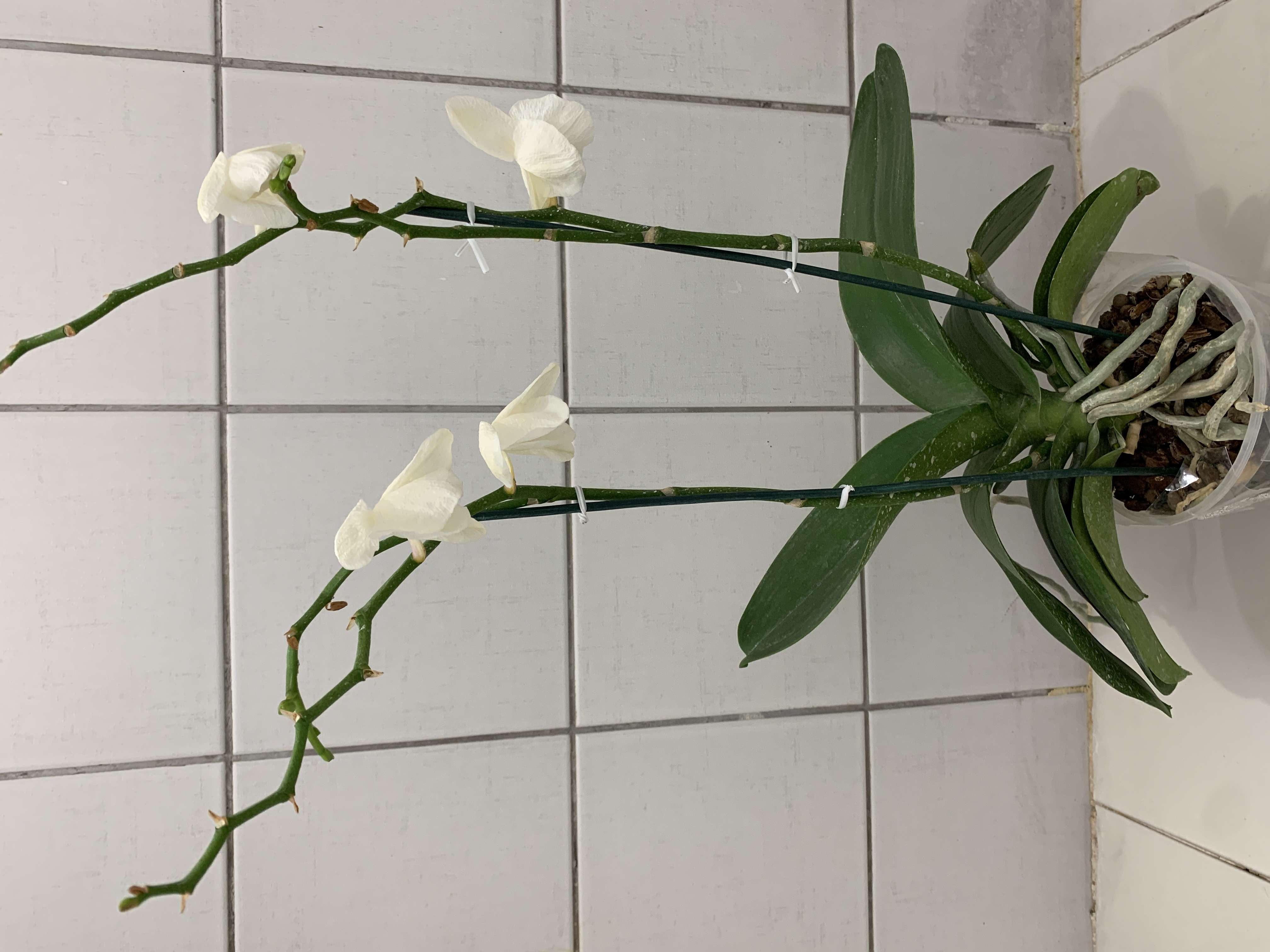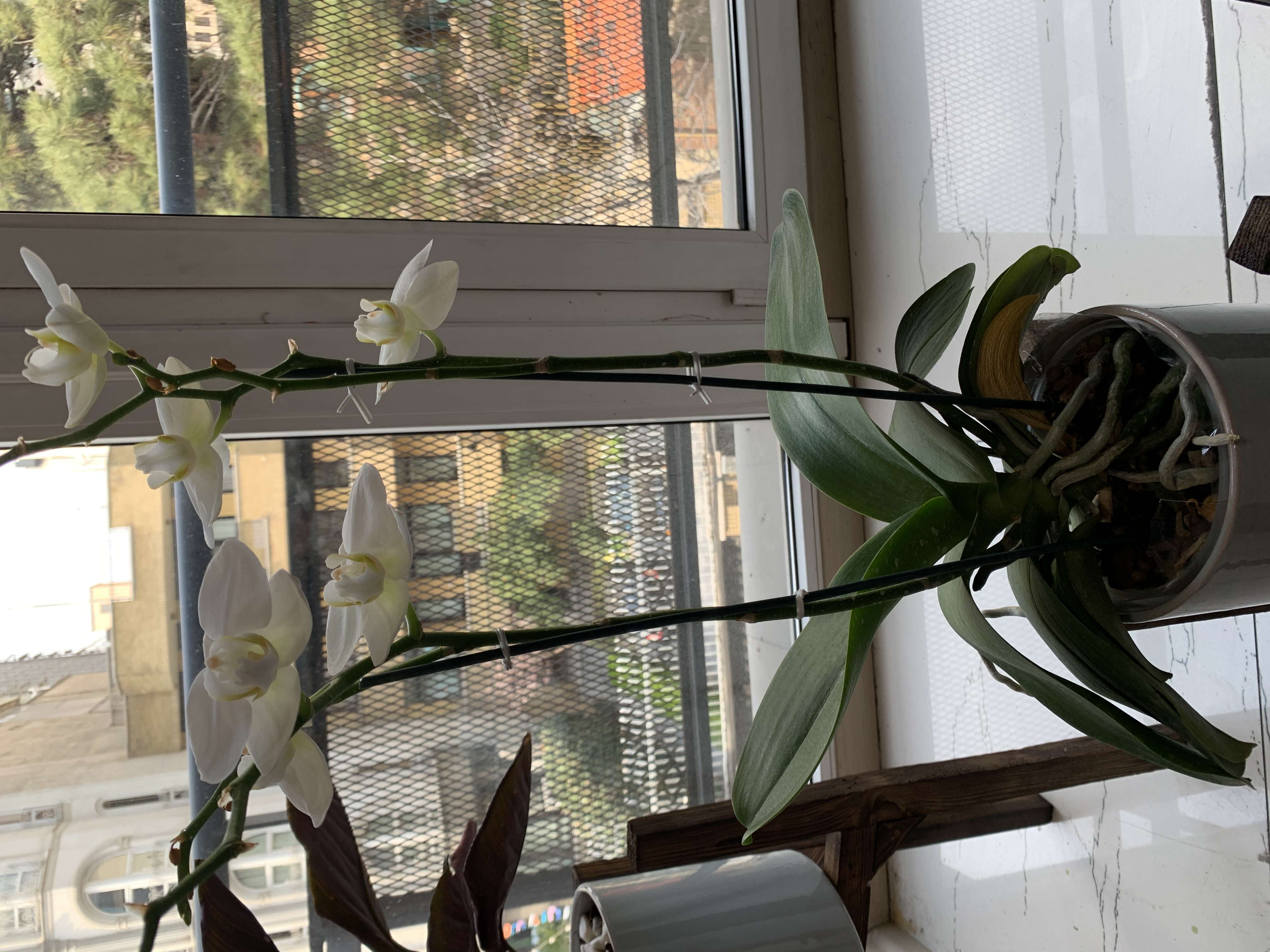 سلام وقتتون بخیر .بله گلها حدود یکماه بر روی گیاه باقی میمونن و بعد از بین میرن .زمانی که ساقه ی گل دهنده خشک شد اونرو قطع کنید و گلدان را با یک سایز بزرگتر تعویض کنید .بعد هم میتونید کوددهی رو براش شروع کنید با کود سه بیست هر دو هفته یکبار تغذیه اش کنید .