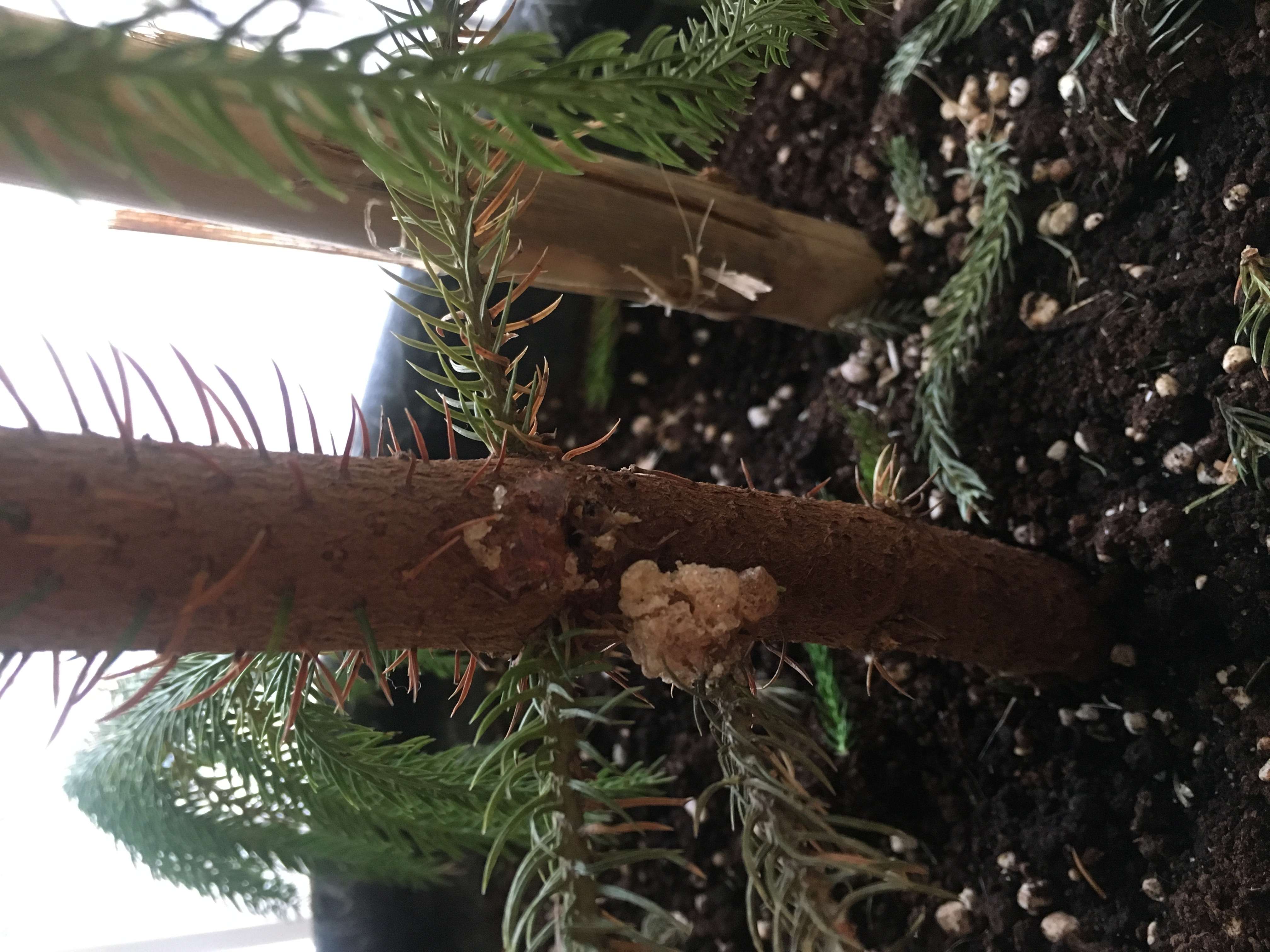 سلام وقتتون بخير حدود يك و ماه نيمه اين كاج خريداري شده ٩ طبقه داره قبلا در دفتركاري نگهداري ميشد هنگام خريد هم برگها بيحال و افتاده بودند گويا از كم آبي بوده مقدار خاكش كم بود كه مقداري خاك تركيبي اضافه شد وآبياري هم هفته اي يكبار انجام شد و مه پاشي ميشد ناگزير چند بار جابجايي داشت و مدتي كنار پنجره نيمه باز بوده كه در معرض جريان هواي بيرون اوايل عيد بوده بعد از مشاهده زرد شدن برگها وريزش دانه اي به جاي ديگر انتقال داديم ولي ريزش و زرد شدن و خشك شدن برگها از طبقات پايين به سمت طبقات بالاتر مشاهده شد ديروز بعد از چرخاندن گلدان متوجه شدم از انتهاي يكي ازشاخه هاي فرعي كه چسبيده به ساقه س صمغي خارج شده و سفت شده كه وقتي صمغ را برداشتم شاخه هم جدا شد و قسمت جدا شده سوراخي پر از صمغ بود و بافتش نرم و له شده احساس ميشد امروز سطح ساقه و برگها راسم اكسي كلرور مس سه در هزار اسپري كردم و مابقي رادرون خاك ريختم لطفا درراين مورد مرا راهنمايي كنيد تا درختچه زيباي كاجم بيشتر ازاين لطمه نبيند😢🙏🏻 در ضمن اگر صمغ مسير آوند را مسدود كرده باشد و مانع رسيدن آب شود چه بايد كرد