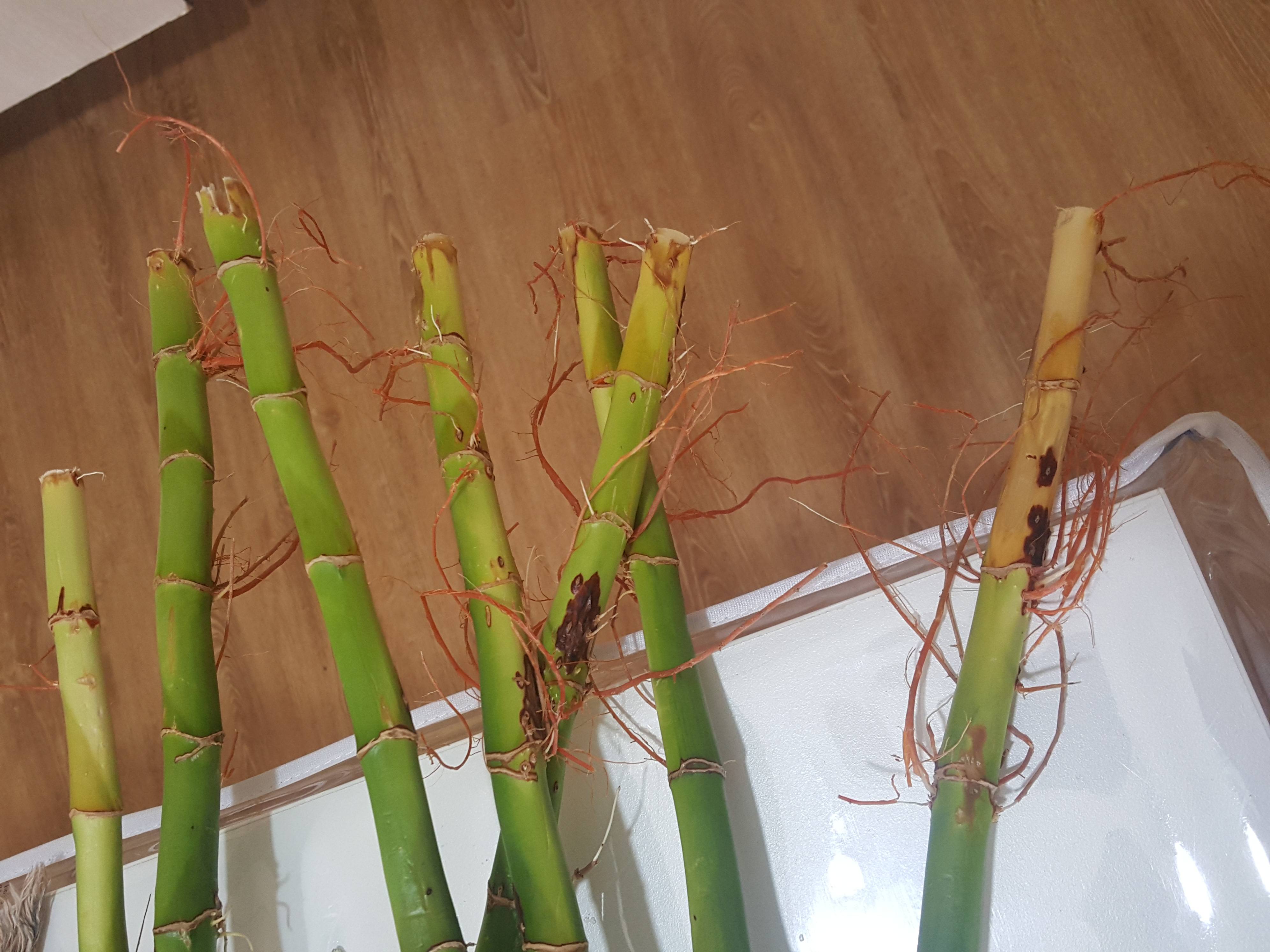 سلام وقتتون بخیر. علت ایجاد شدن این لکه ها و زردی ساقه ها بیماری قارچی است که در اثر نوسان دما و یا تهویه ی نامناسب و یا ماندگی آب گلدان ایجاد شده است . بهتر است در آب گلدان کمی قارچ کش سیستمیک مانند کاربندازیم بریزید و همیشه در آب گلدان یک تکه زغال قرار دهید .اگر سوال دیگه ای دارید در خدمتتون هستم و اینکه آیا ساقه و ریشه ها حالت لزج هم پیدا کرده اند یا خیر ؟