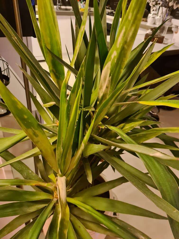 وقتتون بخیر یوکا دچار سفیدک پودری شده که برای کنترلش نیاز به سموم قارچکش مسی دارید مثل بردوفیکس یا اکسی کلرور مس برای بابا ادم حتما پشت برگ رو چک کنید ببینید تارعنکبوت یابرجستگی سیاه میبینید؟