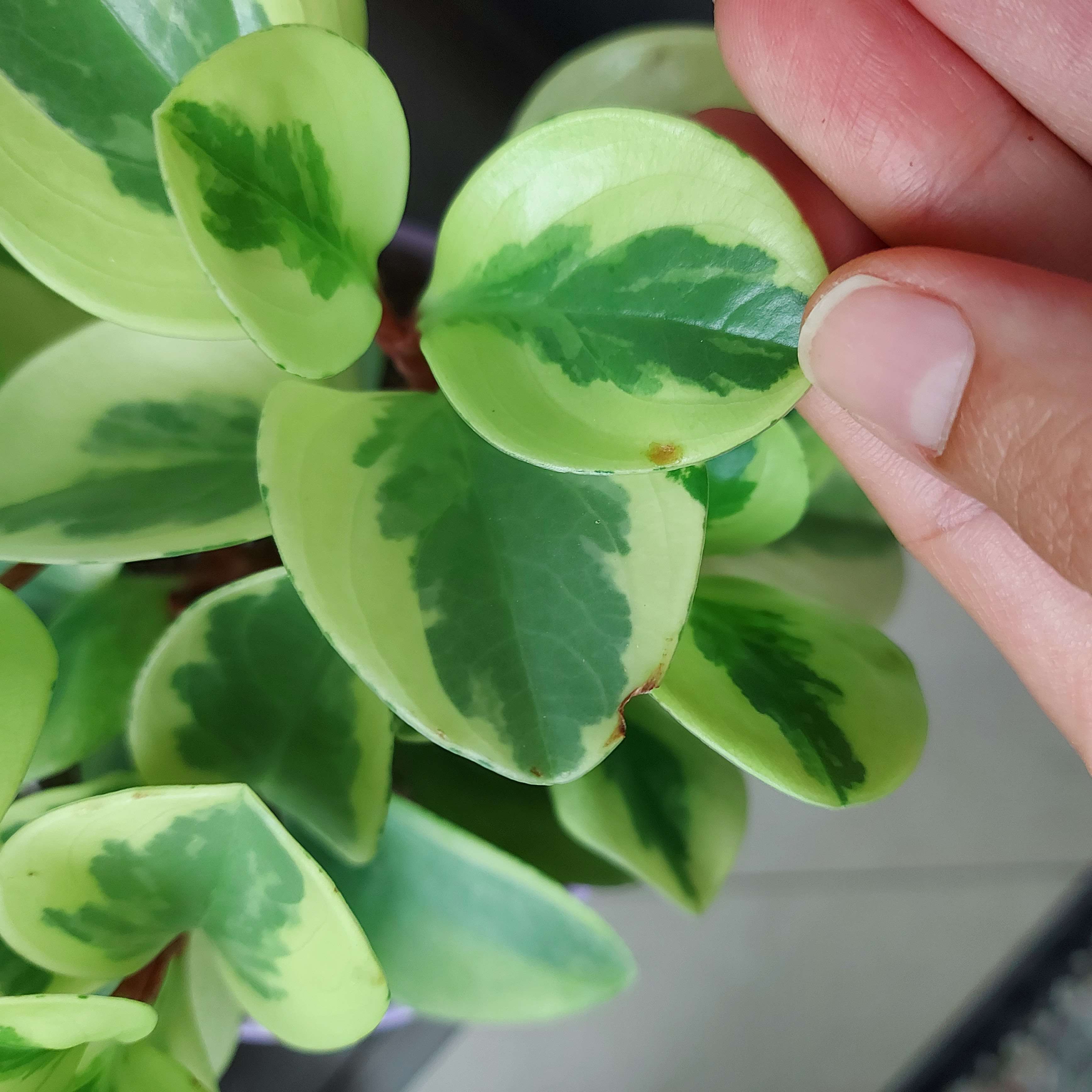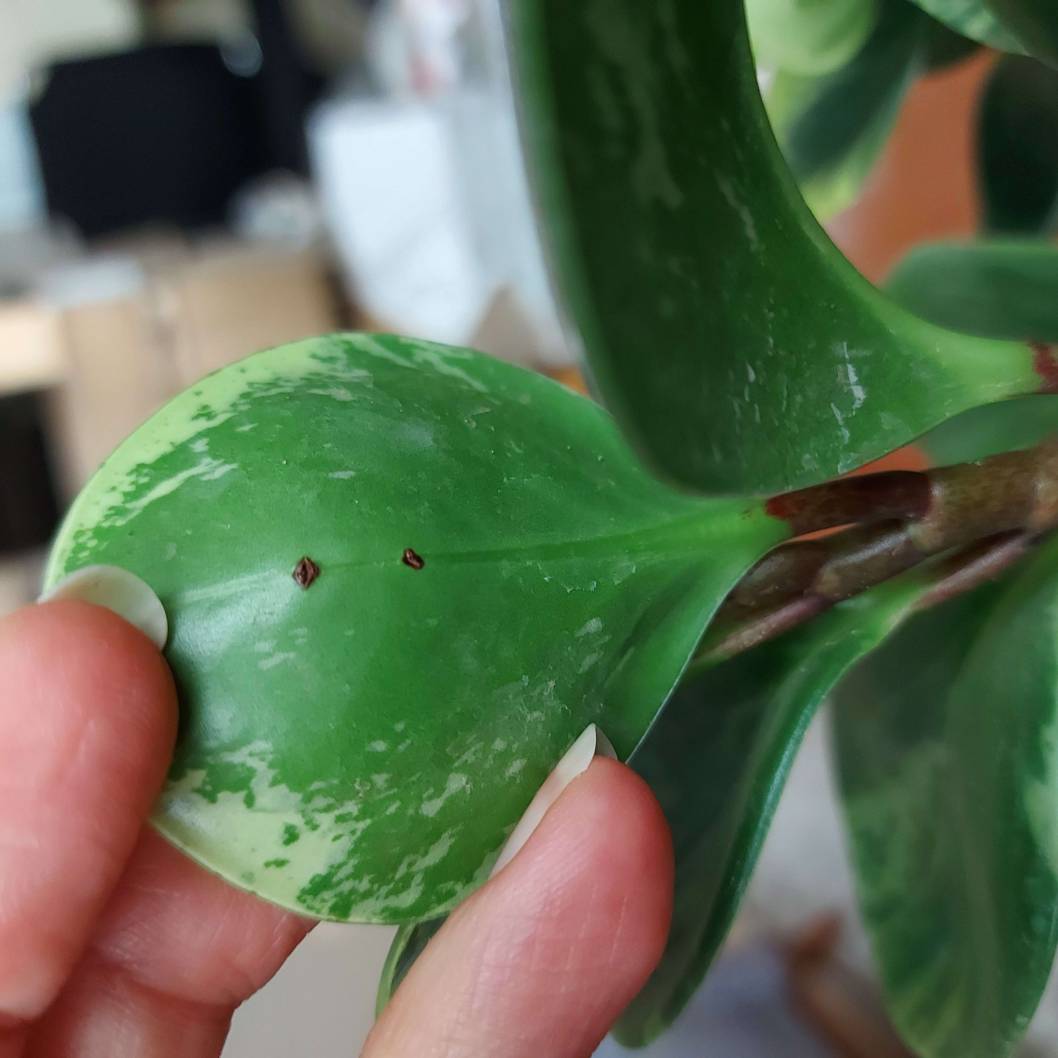 غبار پاشی دیگه انجام ندید این گیاه چون برگ های گوشتی داره با غبار پاشی مستعد بیماری قارچی میشه و حتما یک نوبت از قارچکش استفاده کنید و روند تغییرات لکه رو چک کنید اگر متوقف نشد با فاصله 7 روز دوباره قارچکش اسپری بشه