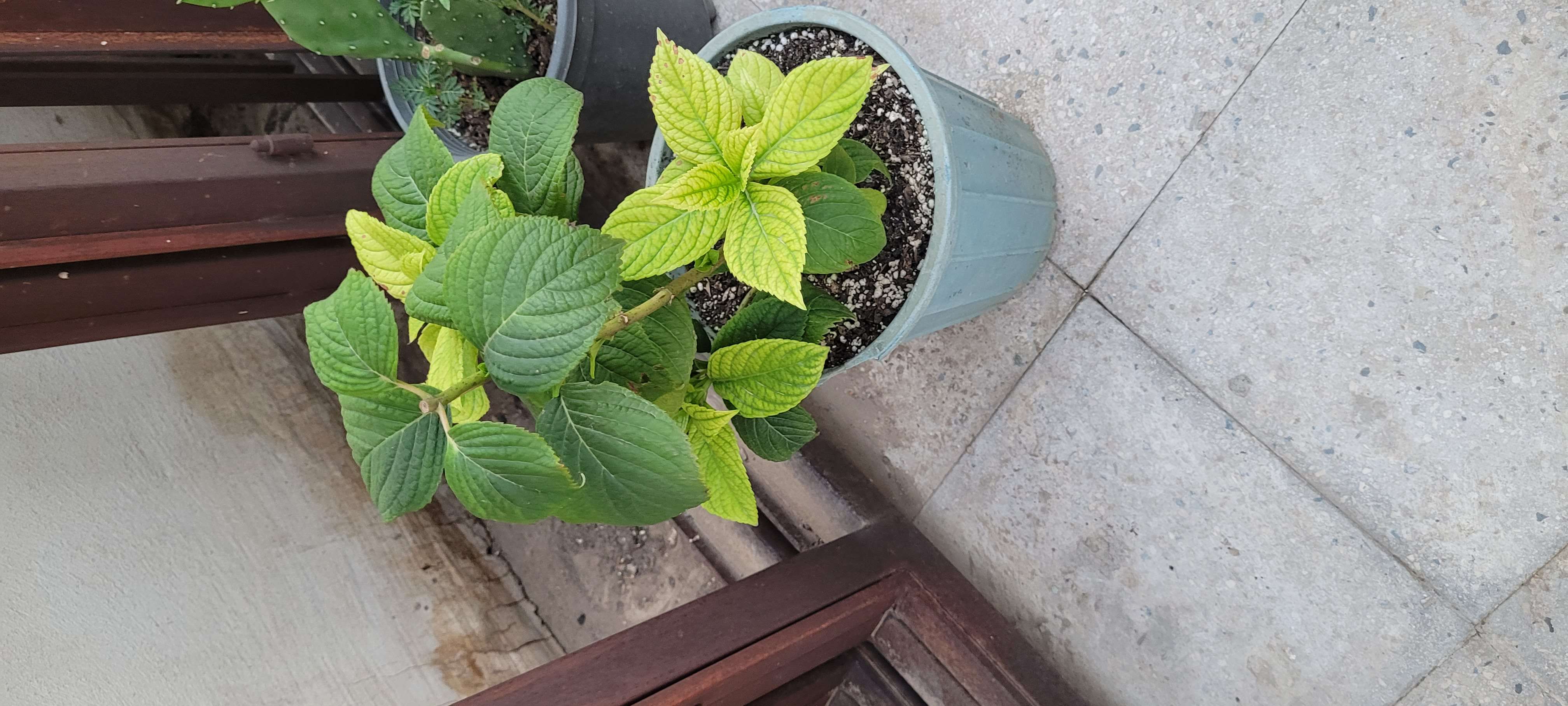 سلام وقت بخیر هورتانسیا برای گلدهی به نور فراوان نیاز داره . علت کمرنگ شدن برگها کمبود مواد غذایی ، نور کم و ابیاری زیاد میتواند باشد ، اگر رگبرگها مشخص هستند گیاه نیاز به تغذیه با کود آهن دارد هر دو هفته یکبار با آهن گیاه را تغذیه مصنوعی کنید . نحوه ی آبیاری به چه صورته؟
